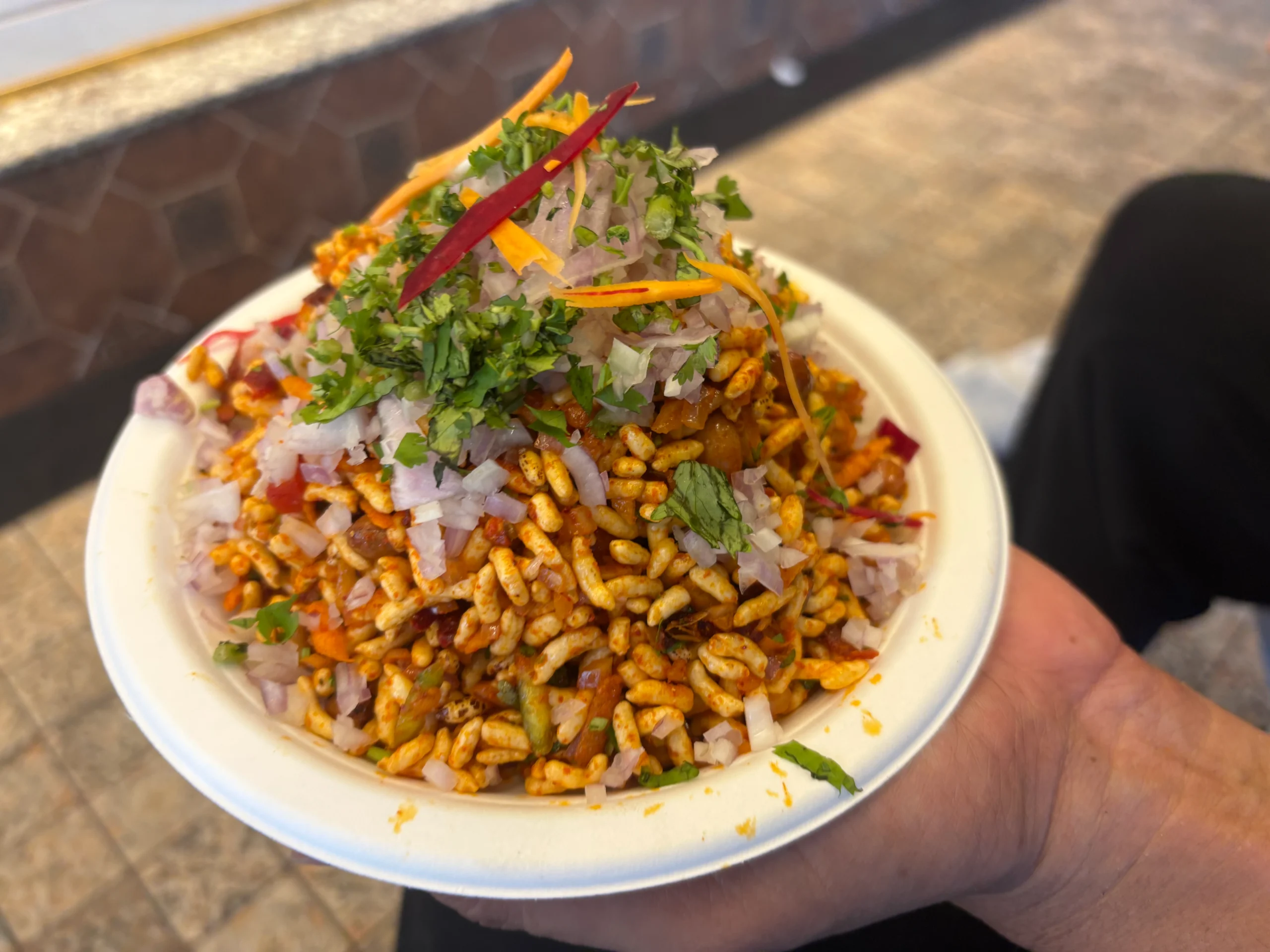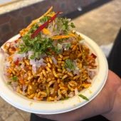 Churmuri is a very popular spicy and tangy street food of Karnatake consisting primarily of puffed rice – it is similar to bhel puri of maharashtra and jhaal muri of bihar/west-bengal. The one served in Champa sweets has typical manglorian taste and consists of puffed rice along with finely chopped onions, tomatoes, grated carrots/turnip, and raw mango. It is a perfect blend of sweetness, tangyness and spice.