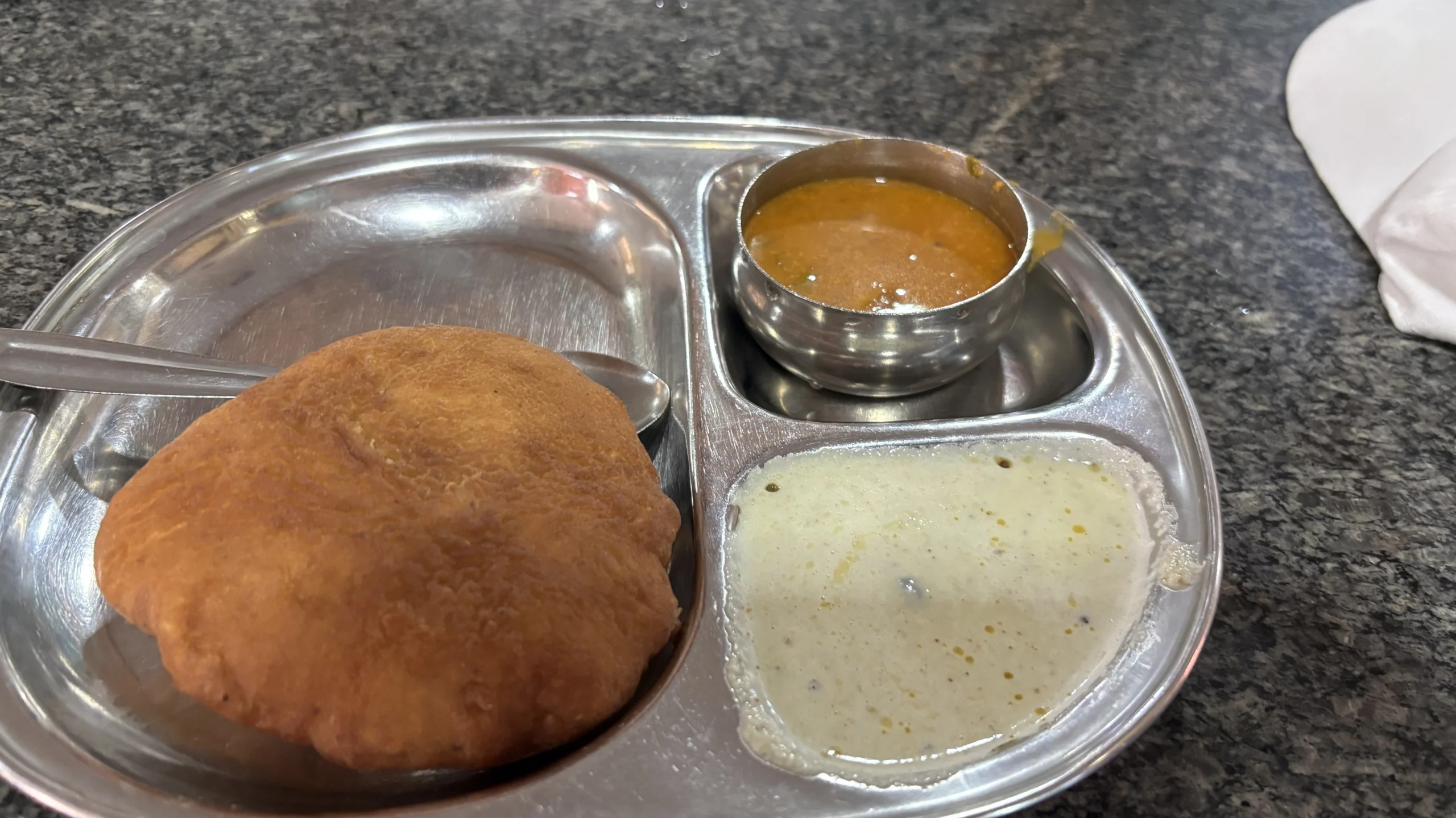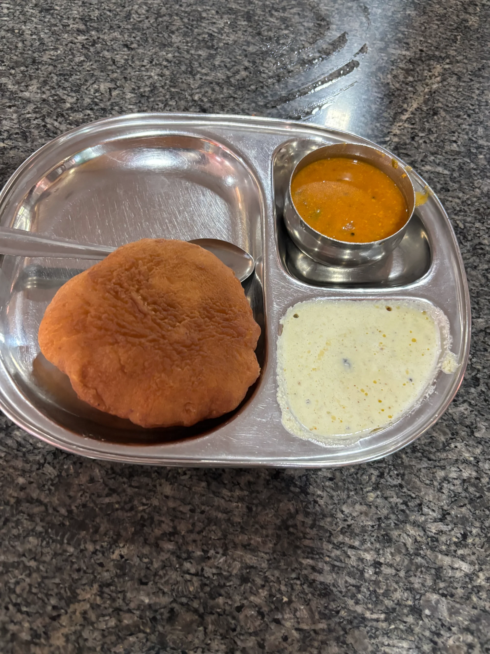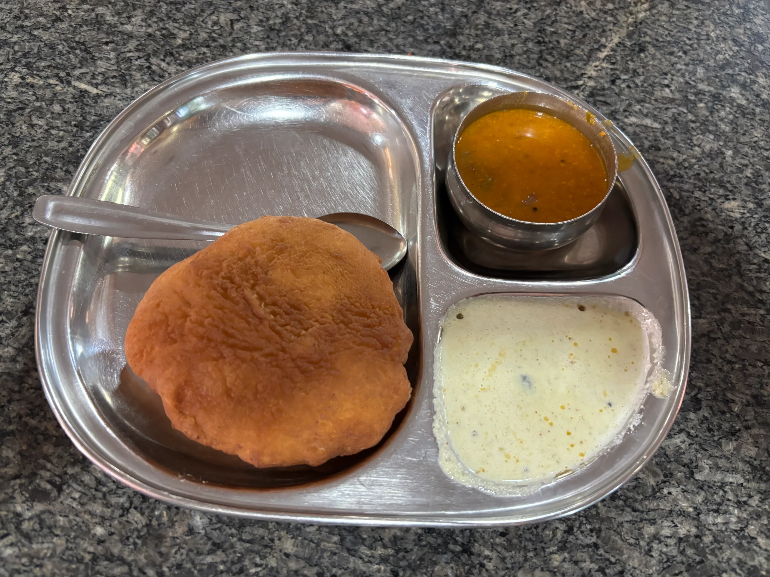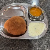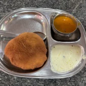 Mangalore Bun at Janatha Deluxe is freshly made, soft and fluffy. It is served with fresh coconut chutney and veg sagu/kurma. Veg kurma is mildly spiced and complements the mild banana sweetness of the buns very well. Cocount chutney is thick and freshly made.